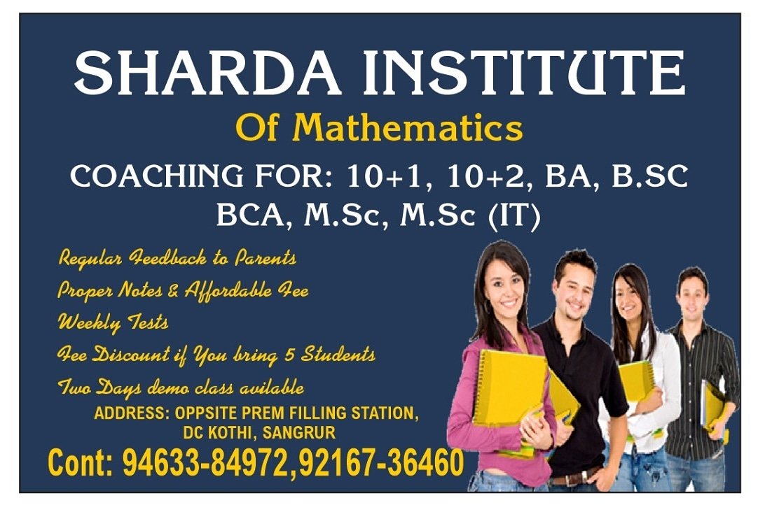 Sharda Institute of MathematicsOpen Now ClaimedMathematicsSangrur Bookmark Write a Review Upvote Downvote123450.000Contact InformationOpposite Prem Filling Station D.C Kothi Road, Sangrur, Punjab 148001Please enable JavaScript in your browser to complete this form.Name *Numbers *Submit View Number Please Verify first Your Name * This field is required. Mobile Number * This field is required. Send OTP Enter OTP * This field is required. Verify Resend OTP Edit Resend OTP will be enabled in 120 seconds.Thanks for enquiry. Send EnquiryPlease enable JavaScript in your browser to complete this form.Name *Numbers *SubmitPhotosOpening HoursMonday7:00 AM - 7:00 PMTuesday7:00 AM - 7:00 PMWednesday7:00 AM - 7:00 PMThursday7:00 AM - 7:00 PMFriday7:00 AM - 7:00 PMSaturday7:00 AM - 7:00 PMSunday7:00 AM - 7:00 PMRelated ListingsSort by: RandomDistance Featured First Add ListingSorry, there were no items that matched your criteria. Please Share This Share this content Opens in a new window Opens in a new window Opens in a new window Opens in a new window Opens in a new window Opens in a new window Opens in a new window Opens in a new window Opens in a new window Opens in a new window